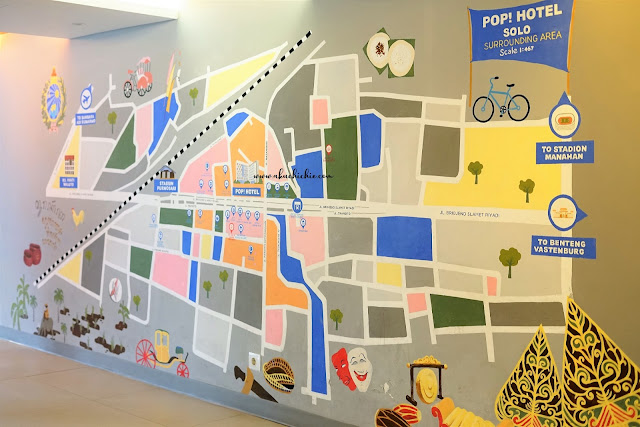 Didepan lift lantai lobi terdapat mural peta sekitaran Pop Hotel Solo nih, ini mengingatkan saya pada suatu guest house di Yogyakarta dimana pada salah satu dindingnya terdapat peta Yogyakarta. Padahal waktu habis moto ini pengen OOTD didepan mural itu tapi malah lupa.