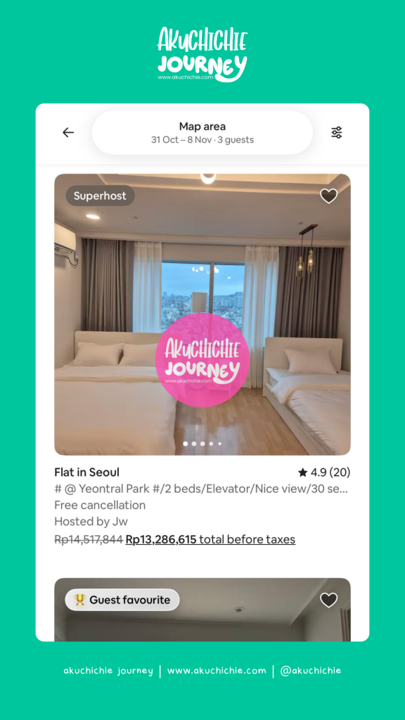 Untuk traveling dengan jangka waktu yang lama dan tempatnya lebih seru untuk explore biasanya kita cari di Airbnb. Seperti waktu ke Korea Selatan, saya pesan apartemen di Seoul dan Busan melalui Airbnb.