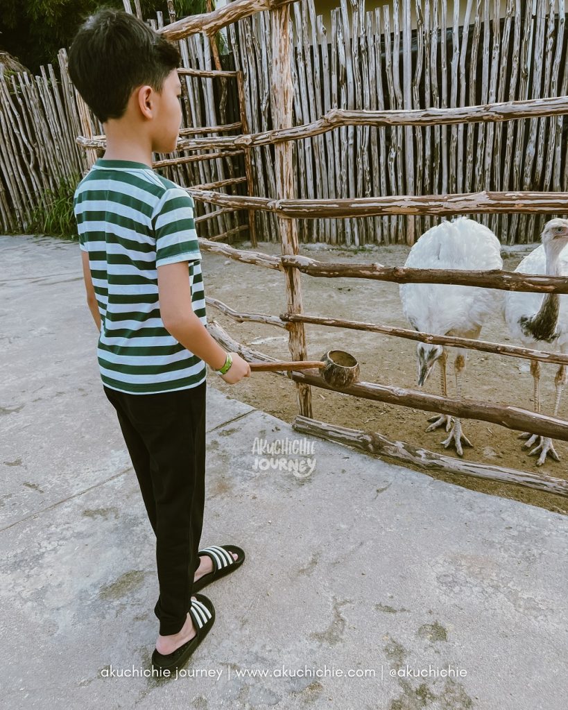 Masih berada dalam satu area, ini namanya Nandu. Ini anakku mencoba memberikan makan kepada Nandu, ada gayungnya gini. Kebayang kalau ditaruh tangan gak mungkin ini tuan muda berani ya.