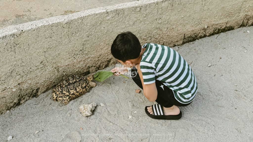 Untuk pertama kali yang kita kasih makan si kura-kura dulu nih. Karena ada beberapa kura-kura yang sedang dikasih makan juga oleh para pengunjung. Jadi anakku memang memilih kura-kura yang sedang sendirian untuk diberikan makanan.
