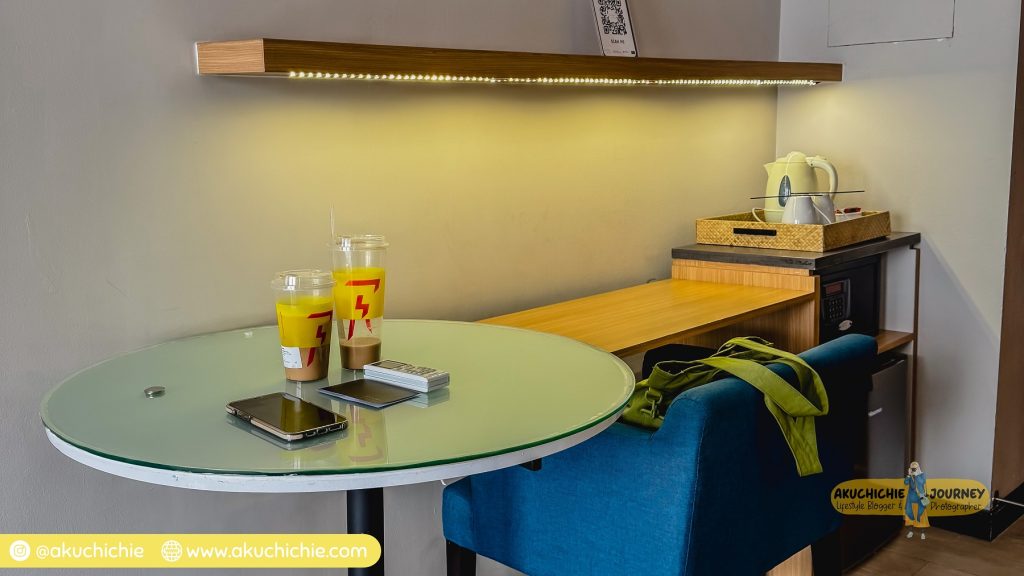 Karena kamar yang diambil untuk bisnis jadi ada tambahan meja kerjanya. Ada brankas juga, ini biasanya hotel-hotel memang selalu sedia sih. Kulkas juga ada, lumayan banget ini bisa menyimpan susu dan juice yang kami beli.
