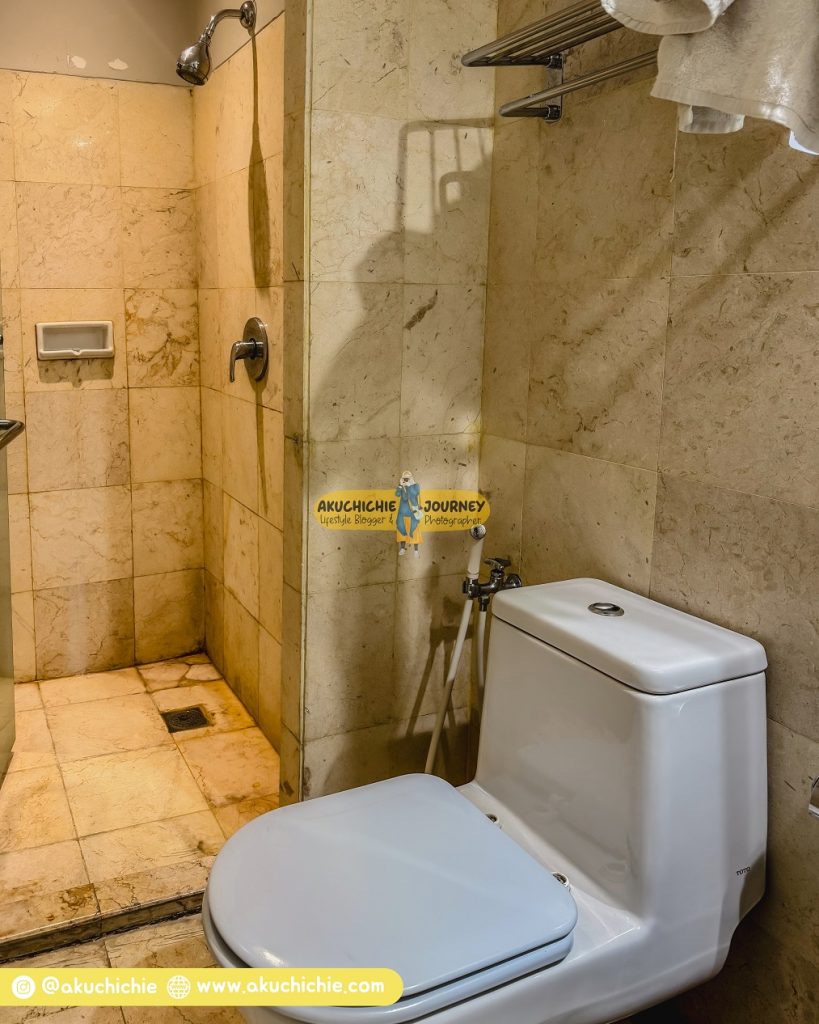 Ukuran kamar mandinya standard sih ya, gak terlalu besar. Untuk yang kamar kita pesan hanya ada shower saja, kalau yang pakai bathup tuh tipe Suite Keluarga dan Condotel.