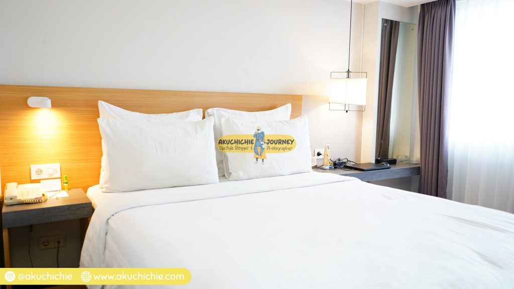 Karena memang kita bertiga, terus kasurnya ukuran queen gini memang lebih berasa ya. Karena biasanya kita kalau menginap kasurnya selalu dapat yang king size.