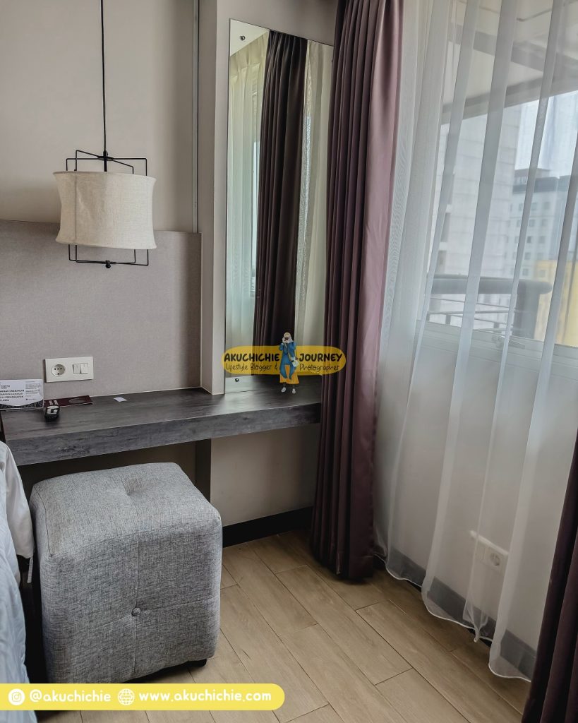 Ada meja rias di pojokan kamar dekat dengan jendela. Tapi tempat itu malah dipakai pak suami kerja sih kemarin, dia pilih disitu kemarin karena lebih enak katanya.