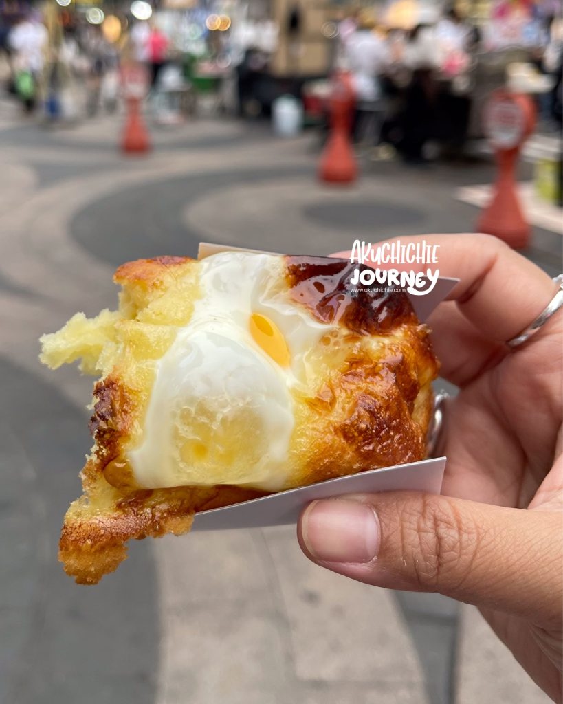 Saya tuh lupa banget ini makanannya apa, tapi dalamnya tuh ada keju mozarellanya. Selain itu ada taburan bumbu di atasnya yang bikin makanan ini enak banget. Teman-teman bisa cobain ini kalau pas ke Myeongdong.