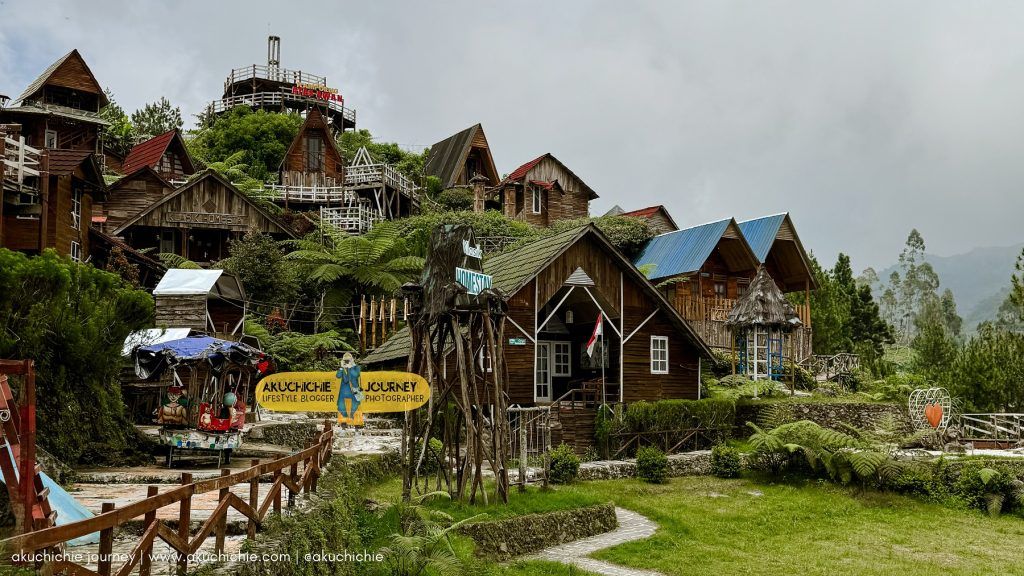 Dari arah kita masuk, langsung dikasih pemandangan seperti ini nih, rumah-rumah kayu yang cakep banget kayak di dongeng gitu ya. Kampoeng Atas Awan in kalau menurut saya memang menawarkan pemandangan alam yang indah, terutama hamparan perbukitan hijau.