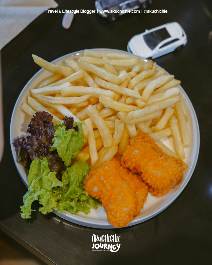 Anakku lagi gak mau makan nasi atau lainnya, dia hanya minta kentang goreng. Tapi ternyata ini paketannya ada chicken nugget dan juga sayur hijau yang berujung saya yang makan.
