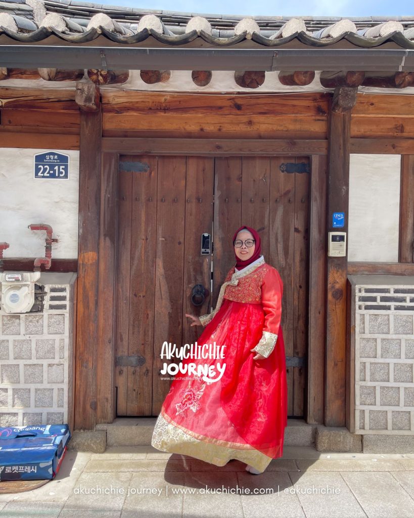 Nah, ini kedua kali ke Korea Selatan dan memang sudah niat mau jalan-jalan di Bukchon Hanok Village pakai hanbok. Kebayang gak tuh, siang-siang menterang waktu itu saya mengenakan hanbok warna merah gini.