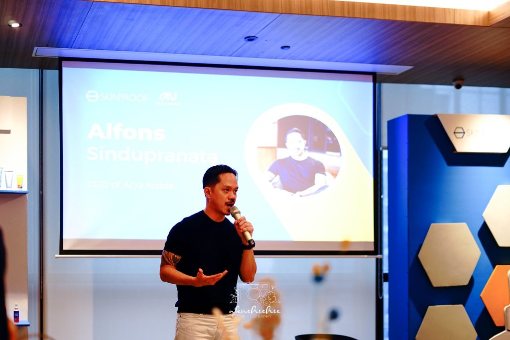 Alfons Sindupranata, CEO dari Arya Noble memperkenalkan Skinproof yang telah dipercaya oleh berbagai perusahaan ternama untuk melakukan evaluasi produk kosmetik dan riset konsumen untuk mengembangkan produk yang kredibel, dan dapat menjadi game-changer di pasar kosmetik yang terus berkembang.
