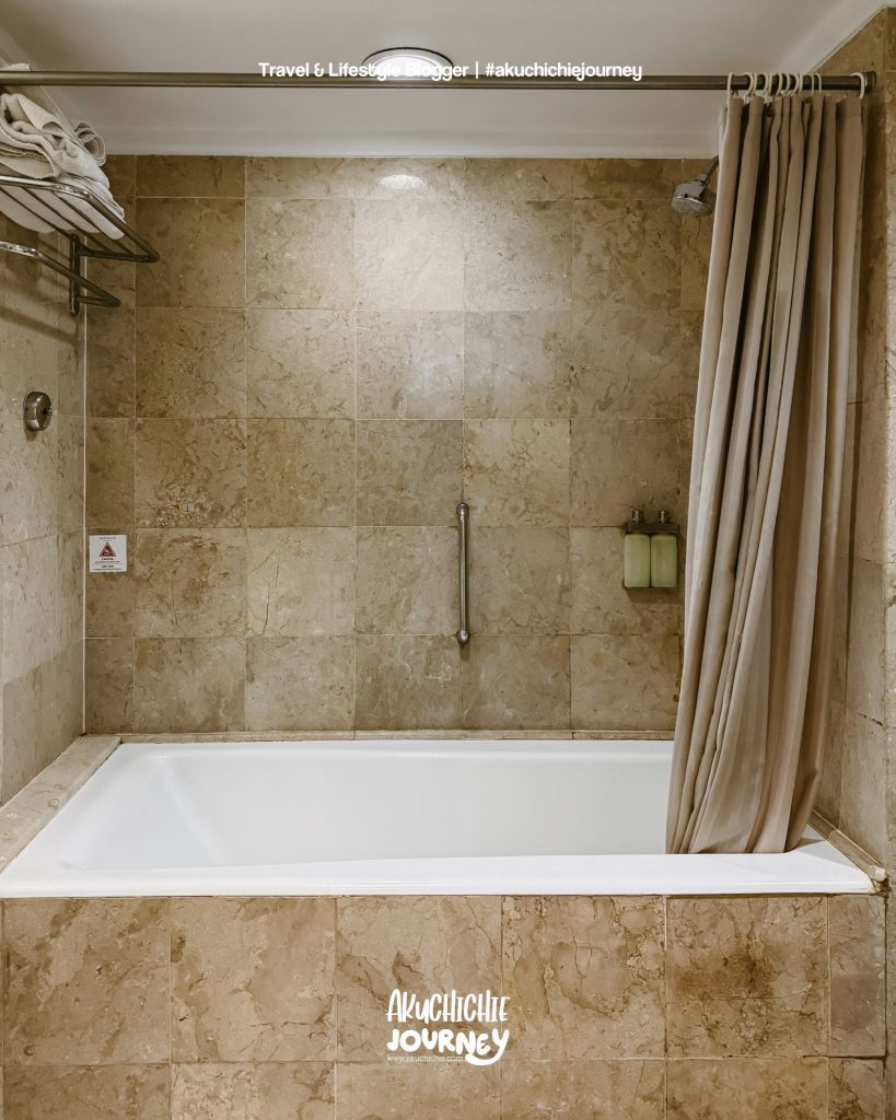 Gongnya sih ini, salah satu alasanku memilih si Hotel Aryaduta Bandung karena kamar mandinya ada bathub. Kemarin tuh setelah ngobrol sama pak suami, mengingat ini longweekend jadi cari kamar yang ada bathub.