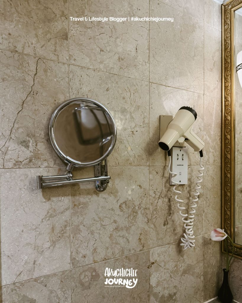 Nah untuk kamar mandinya nih masih sentuhan hotel lama bangetkan tapi tuh bersih deh. Air hangat dan dinginnya juga menyala dengan baik, makanya suka banget ini. Perlengkapan toiletriesnya juga lengkap sih menurutku.