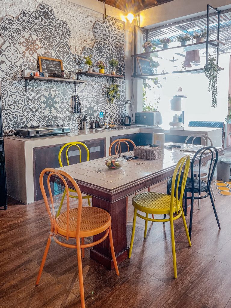 Kalau masuk dari pintu berwarna toska yang eye catching itu pasti langsung berjumpa dengan teras yang cantik ini. Aku dong pas masuk langsung bilang ke makmin lainnya “selamat datang di rumah saya” hahahahaa…. Asli sih ini memang berasa rumah banget, nyaman banget kayak lagi nyenderin Nicholas Saputra gitu.