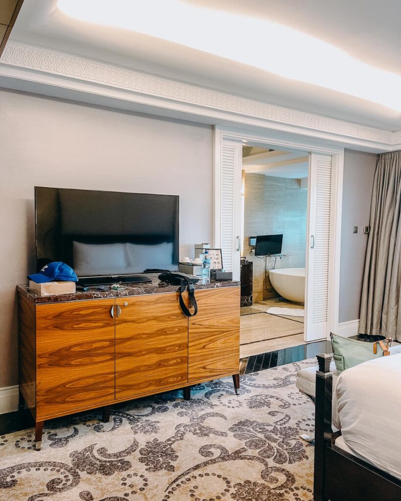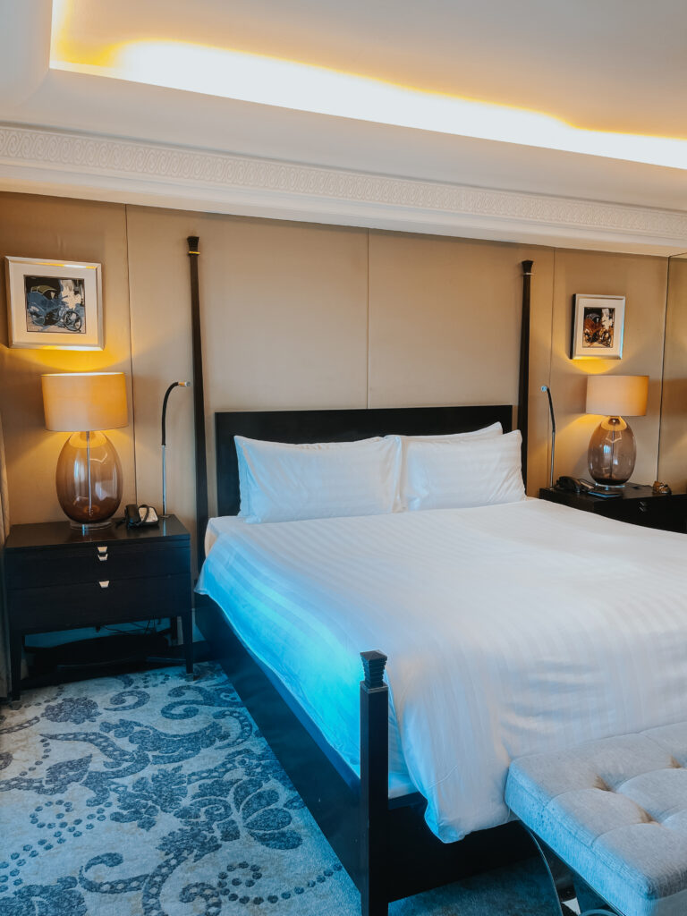 Ukuran kamarnya lumayan banget ini 64m, fasilitasnya juga lengkap (yailah Kempinski). Ukuran tempat tidurnya kita yang Super King, masih sangat okelah untuk bertiga. Pokoknya ini kamarnya tuh bikin magerlah mau kemana-mana.
