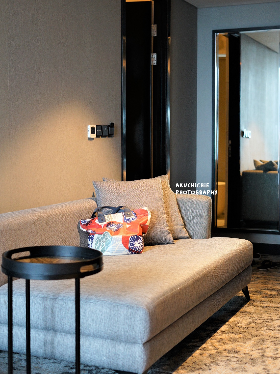 Selain ada sofa panjang dekat pintu masuk, juga ada single sofa buat leyeh-leyeh disamping tempat tidur. Ini sofa yang sering saya dudukin selama nginep di JHL Solitaire. Sayangnya ini meja kerja gak terlalu besar tapi lumayanlah itu bisa buat update kerjaan dan konten. Sementara pak suami pun selalu membawa serta laptopnya untuk update kerjaannya.