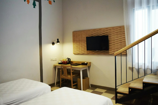 Waktu kemarin booking milih yang family room dengan nama kamar Duplex Trendy, dimana pada kamar tersebut terdapat 2 lantai. Lantai bawah terdapat kamar mandi, 2 tempat tidur double bed dan meja dipojokan yang ada tvnya.